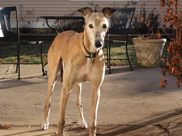 But time is relentless, and Jazzy got older. We had to do more things for him as he became weaker, and over time little bits of his personality became little more than memory. We carried him up and down stairs for his last couple of years, but eventually even walking became difficult. He was diagnosed with cancer in his 14th year, and there was little we could do except manage the pain and keep him company. It finally became clear to us that he was too unhappy to go on, so on the morning of his 15th birthday, February 7, 2007, we let Jazzy go. He had the best life a retired greyhound could ask for, and two people who loved him very much. He was a part of our lives and our home for so long that his absence leaves a gaping hole, but we will fill it with memories, visions of a bright red brindle boy galloping in the sunshine, of his crazy legs in all directions as he sleeps on his back on the bedroom floor, of his big brown eyes gazing dreamily at us over the arm of his couch. We will miss you, Jazzyboy.